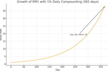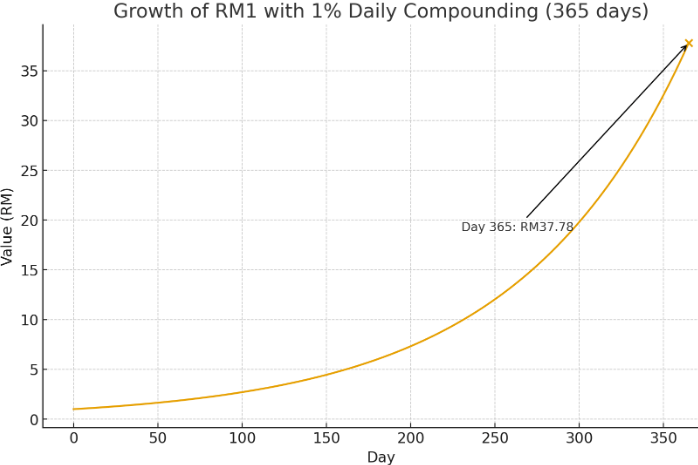 Day 365: RM1 × (1.01)^{365} ≈ RM37.78
